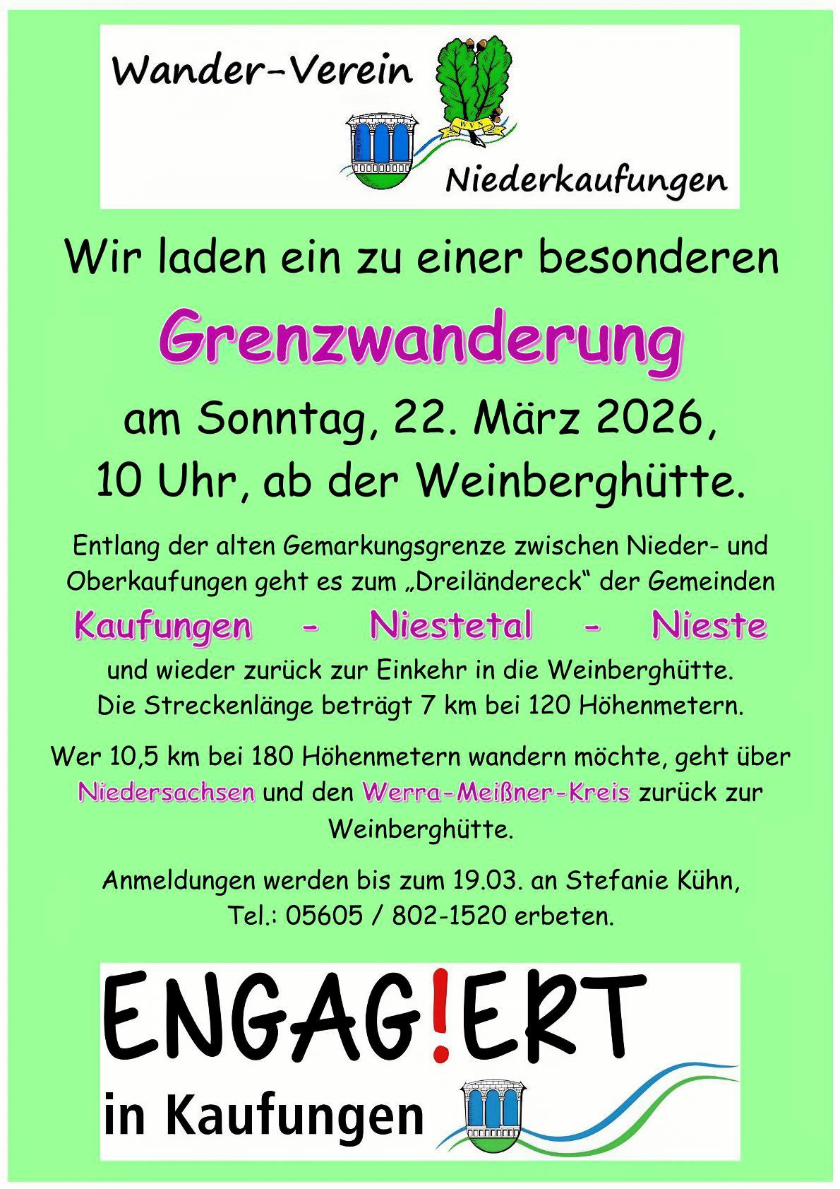 In Zusammenarbeit mit den Engagementlotsen- und lotsinnen der Gemeinde Kaufungen laden wir zu einer besonderen Grenzwanderung ein. Die Wanderungen beginnen und enden an der Weinberghütte mit Schlusseinkehr.