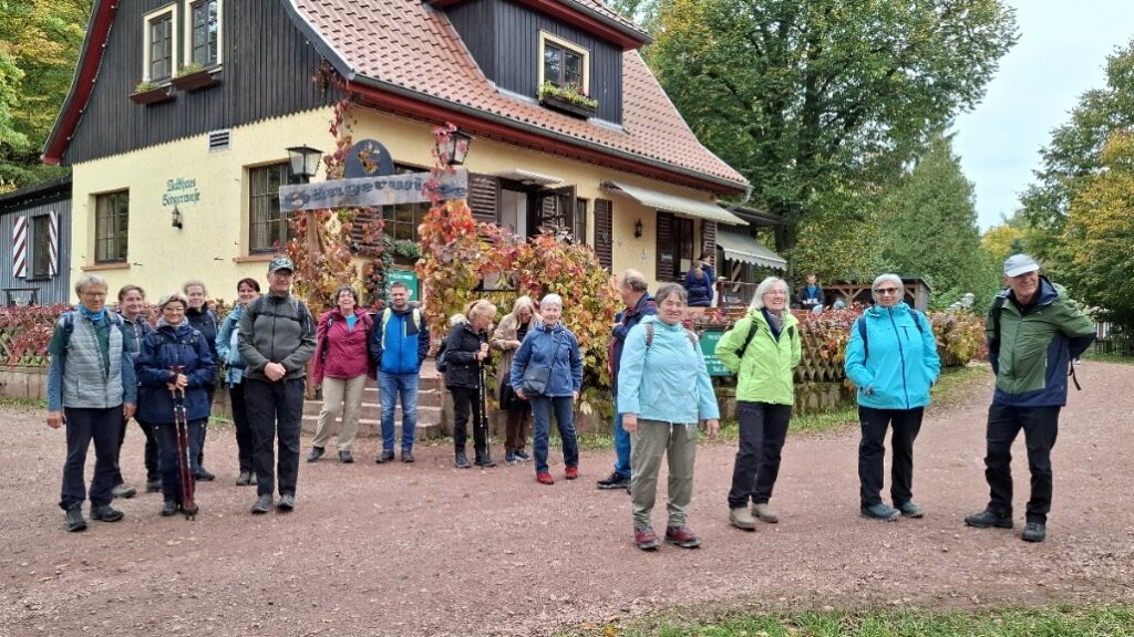 Gegen 10 Uhr starteten 9 „Kurzwanderer“ in Niederkaufungen und fuhren nach Rimbach am Hanstein. Von hier ging es mit Wanderführerin Angelika M. ebenfalls zur Berghütte an der Teufelskanzel. Für beide Gruppen waren zur Mittagseinkehr Plätze bestellt.
